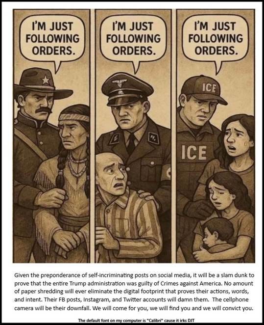 The good news will be that the investigators and prosecutors in a future Nuremberg trial will have the means to compel, compile and collate the digital word that we live in and determine guilt. Following orders was dismissed as a credible defence for the Nazis in 945-46 and beyond. It won’t protect the ICE agents or the Trump administration either.